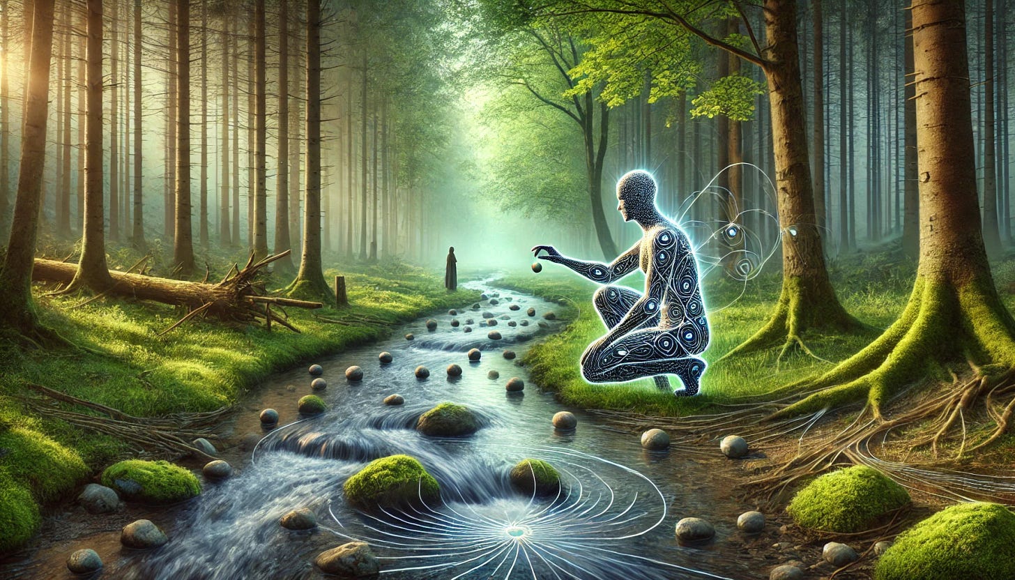Te sientas junto a él y observas cómo coloca pequeñas piedras en el arroyo,